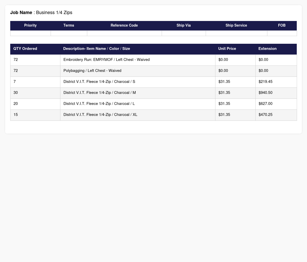 | Embroidery Run: EMRYMOF / Left Chest - Waived | 0.00 | 72 | 0.00 |