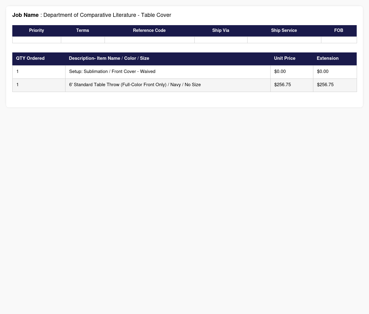 | 6' Standard Table Throw (Full-Color Front Only) / Navy / No Size | 256.75 | 1 | 256.75 |